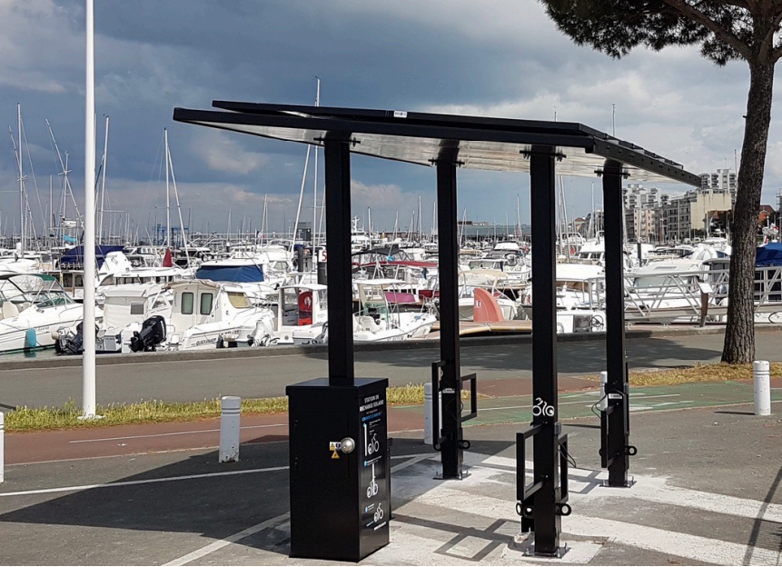 La Canopée: This solar charging station works as modules. Each module can charge up to 6 electric bikes or electric scooters simultaneously. These modules can be assembled together to accommodate dozens of bikes. The modules can be open, semi-open, or closed, with full cover or transparent fencing.