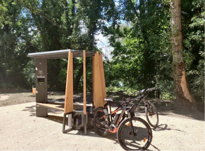 La Cabanavélo: This solar charging station can charge up to 3 electric bikes simultaneously and provides USB outlets for phone charging. It also offers comfortable seating for 3 to 4 people, allowing visitors to relax and enjoy the scenic views while waiting for their bikes to charge. It is particularly suitable for mountain environments or exceptional views.
