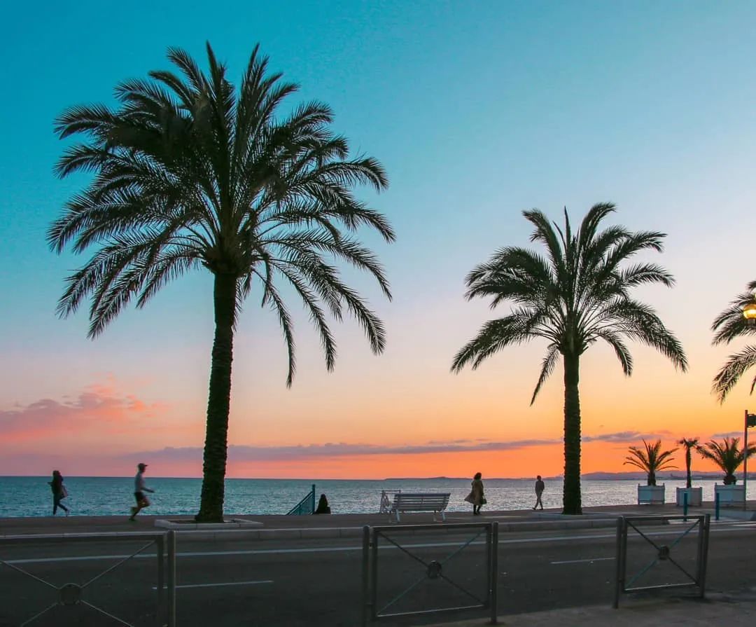 The elegant British stroll along the 7-kilometer-long Baie des Anges, a stretch of unobstructed blue scenery that transforms with the southern French sunshine from dawn to dusk.