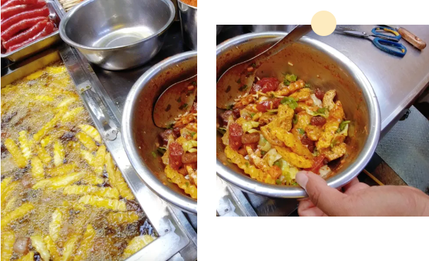 Fried potatoes are everywhere, cut into cubes or wavy "wolf tooth" shapes, then tossed with chili powder, zhe'ergen, and other seasonings. One bite leads to another—it’s simply addictive.