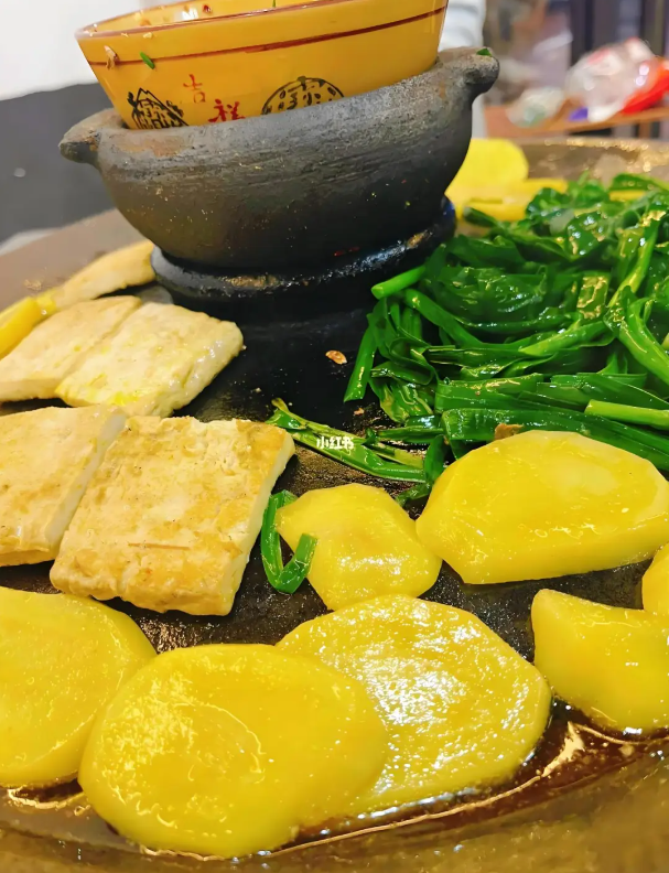 Not trying "griddle cooking" ("Luoguo" in Chinese) in Guizhou would be a regret, and potatoes are like a foundational ingredient for this dish. Slice the potatoes thickly and place them against the edge of the griddle to cook slowly. Even if they get a bit "overcooked," it’s fine—the goal is a slightly crispy exterior with an incredibly soft and tender inside that breaks apart easily with chopsticks.