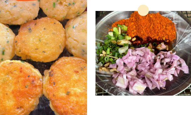 Egg-wrapped potatoes feature mashed potatoes enveloped in a golden egg wrap. One bite combines the aroma of eggs with the savory taste of potatoes, making it irresistible! The mashed potatoes are mixed with ingredients like zhe'ergen (Houttuynia cordata), crispy pork bits, and scallions. If you can’t stand the smell of zhe'ergen, be sure to mention it in advance.