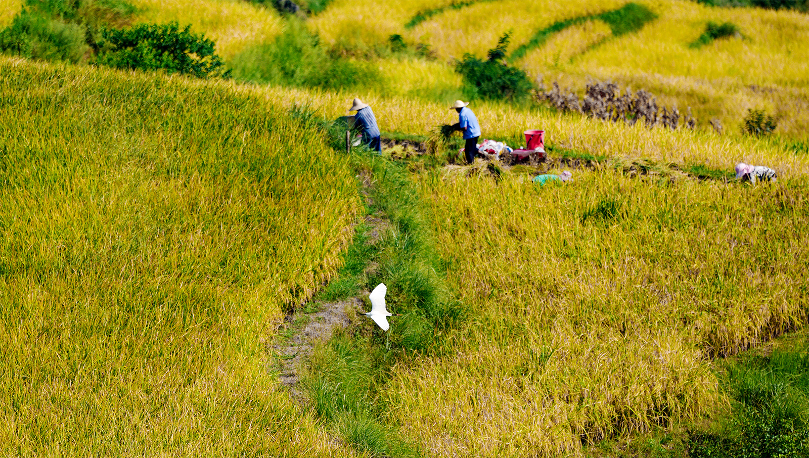 More than 100 hectares of rice fields are ready for harvesting at Guojiawan Village in Yuping Dong Autonomous County, southwest China's Guizhou Province. Golden terraces stretch across the landscape, with the delightful aroma of ripening rice filling the air.