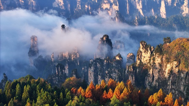 A sea of clouds recently gathered after a spell of rain this early winter in the Wulingyuan scenic area of Zhangjiajie National Forest Park in central China's Hunan Province. The misty scene, coupled with colorful foliage adorning the park's iconic peaks, resembles a series of natural mountain paintings. With temperatures fluctuating, the region is anticipated to experience its first snowfall in December.