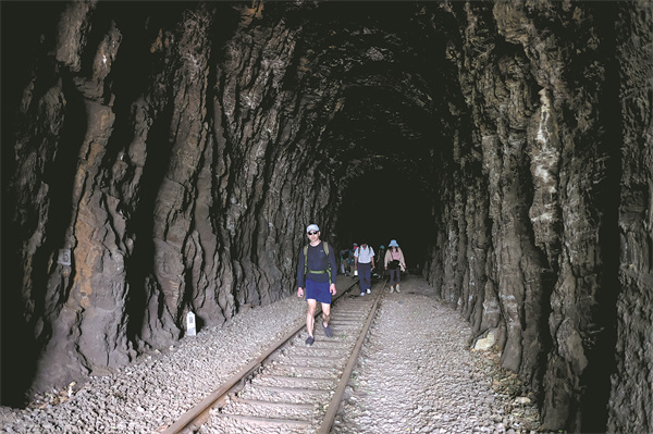 Visitors hike out of a tunnel following the 1-meter-gauge railway track in Yiliang county, Yunnan, on May 1 last year.[Photo provided by Li Jiaxian/China News Service]