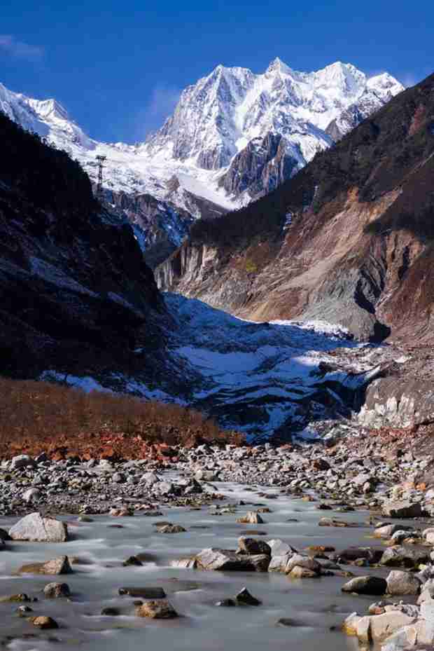 贡嘎山是中国现代海洋性冰川最发达的地区,有数百条冰川,面积达300余平方公里。海螺沟也拥有世界最壮观的大冰瀑布,宽1100米,高1080米,仿佛从蓝天直泄而下的一道银河,终年都有频繁的冰崩。