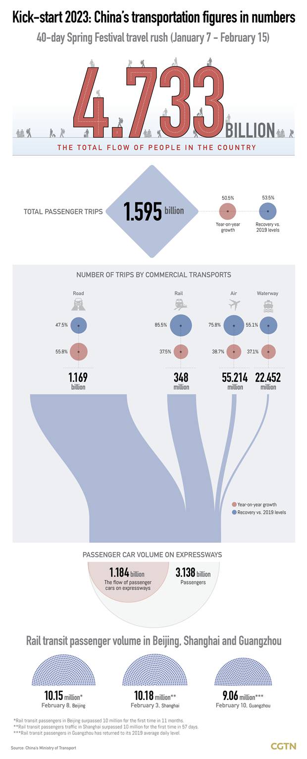 The total flow of people in China came in at 4.733 billion during the 40-day Spring Festival travel rush this year, according to the China's Ministry of Transport.