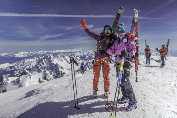 中法联合登山代表以勃朗峰为背景,在南针锋展示IMTA、IMTD旗帜
