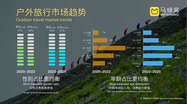首先,我们看一组马蜂窝关于户外的数据。2020年后中国进入户外旅行高速增长期,其中20-22年算是入门期,因为长线旅游限制,更多用户开始关注户外,以男性为主,年轻人居多。但23年至今发生一些微妙变化,越来越多女性开始玩户外,成为她们日常拿来晒的生活方式,女性的消费力显然更高。再看年龄层,玩户外的中老年群体在增多,一些是亲子家庭,一些是退休族,这一点从“始祖鸟”爆火也能看出来。性别和年龄“更均衡”,本质上是户外运动在“破圈”,不再是直男和年轻人的专属,正在从小众专业走向大众多元的新消费。
