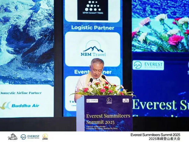 国际山地旅游联盟“山地旅游亲善大使”夏伯渝在2025珠峰登顶者峰会发布倡议 (图源:尼泊尔珠峰联盟)