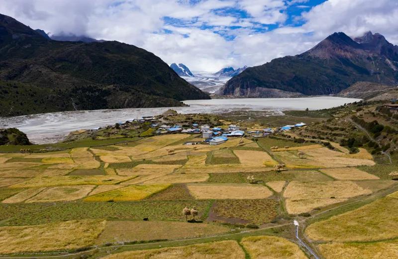 来古冰川是帕隆藏布江的源头之一,冰雪融水流进然乌湖,湖畔是茂密的原始森林,远观宏伟壮丽,近观纯净无暇,在然乌湖可以零距离与冰川进行亲密接触。在然乌湖一侧,有一座名叫来古村的藏族村落,2019年被中国国家地理评为“中国最美山村”,进入村庄,能看到规模巨大的来古冰川和围绕着来古村的一座座雪峰,辉煌、纯洁又壮美。