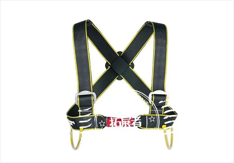 全身安全带是在坐式安全带的基础上增加了一根背带,主要受力点在胸部或背部,在拓展中用于可导致参训者在空中翻滚或需要从身后进行保护的项目。
