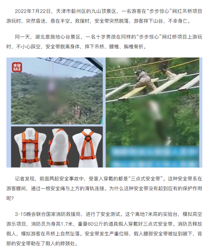 3月15日“国际消费者权益日”当天,央视财经频道发布《景区高空项目,安全带“不安全”!“三点式安全带”或有脱落风险》一文,介绍了在景区高空项目中,因“三点式安全带”脱落而造成的安全事故。很多景区因为时间及经济成本选择了“三点式安全带”而忽略项目的安全性,也引起了大众对安全带的思考:安全带真的安全吗?