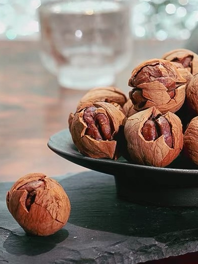 临安的山核桃长在陡峭山坡上, 采的时候得绑着安全带敲 别嫌剥壳麻烦, 这玩意就贵在“费手的香”!刚炒好的核桃壳脆, 咬开满是油脂香, 嚼着嚼着还带回甘, 比普通核桃香多了。嫌麻烦就买剥好的核桃仁, 拌酸奶、撒麦片,早上吃一碗, 扛饿到中午都不饿。