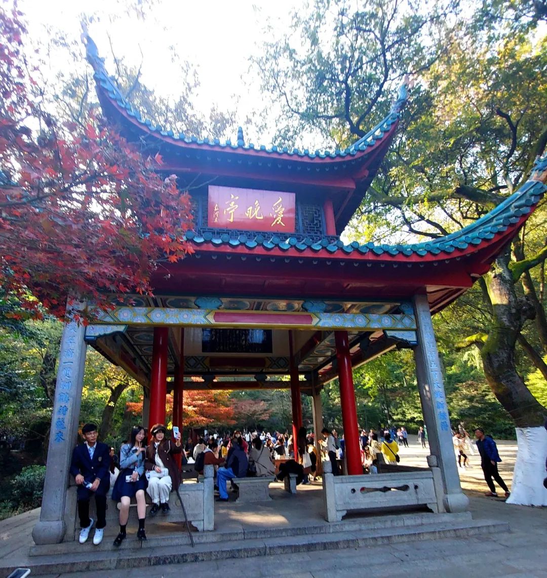走进清风峡中爱晚亭,激情燃烧。唐诗”停车坐爱枫林晚,霜叶红于二月花”,为亭增添了无限诗情画意。