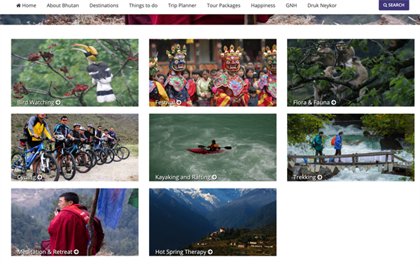 从市场营销方面看,不丹的旅游宣传口号同样独特,恰如其分地叫做:“不丹–幸福所在的地方”(Bhutan: Happiness is a Place!),与追求幸福指数的国家形象高度吻合。