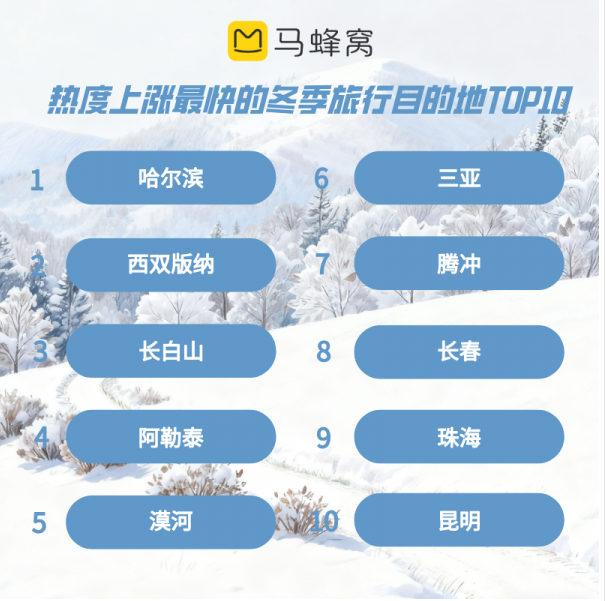 近日,马蜂窝发布2025年冬季“旅行蜂向标”,根据马蜂窝平台的用户浏览、搜索、分享、消费、评价等旅游大数据,对冬季最新旅行消费趋势进行分析和预测,启发游客冬季出游灵感,为游客提供出行决策参考。