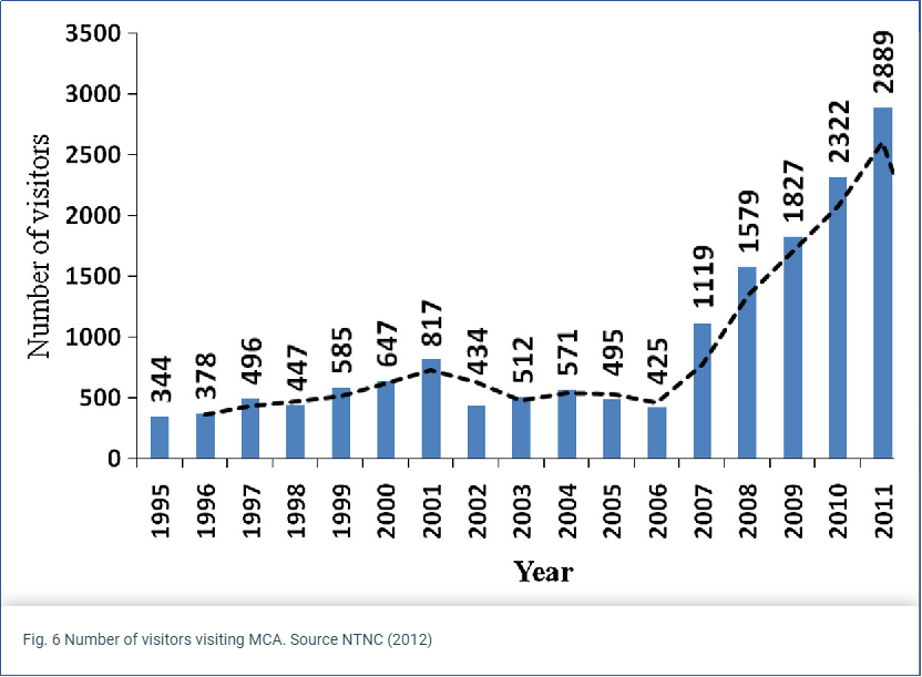 MCAP一直在该区域通过各种方式以激励和动员当地人民带头管理他们自己的资源。目前正在开展广泛的方案,以提高当地人民对其自然遗产的认识,使他们了解并能够以可持续的方式利用资源。MCAP在该地区可持续旅游业发展中的作用十分显著。通过不断支持建立与旅游有关的多样化服务,如寄宿家庭,露营地和住房。升级步道基础设施,管理遗产和住宿服务,实施废物管理支持系统,提升当地的旅游从业者能力和技能等方式,为游客提供最佳体验。同时也与政府密切合作,以促进该地区的整体发展。1998年成立MCAP之后,该地区游客人数持续增长。近年来,该保护区的旅游人数逐年稳定增长。