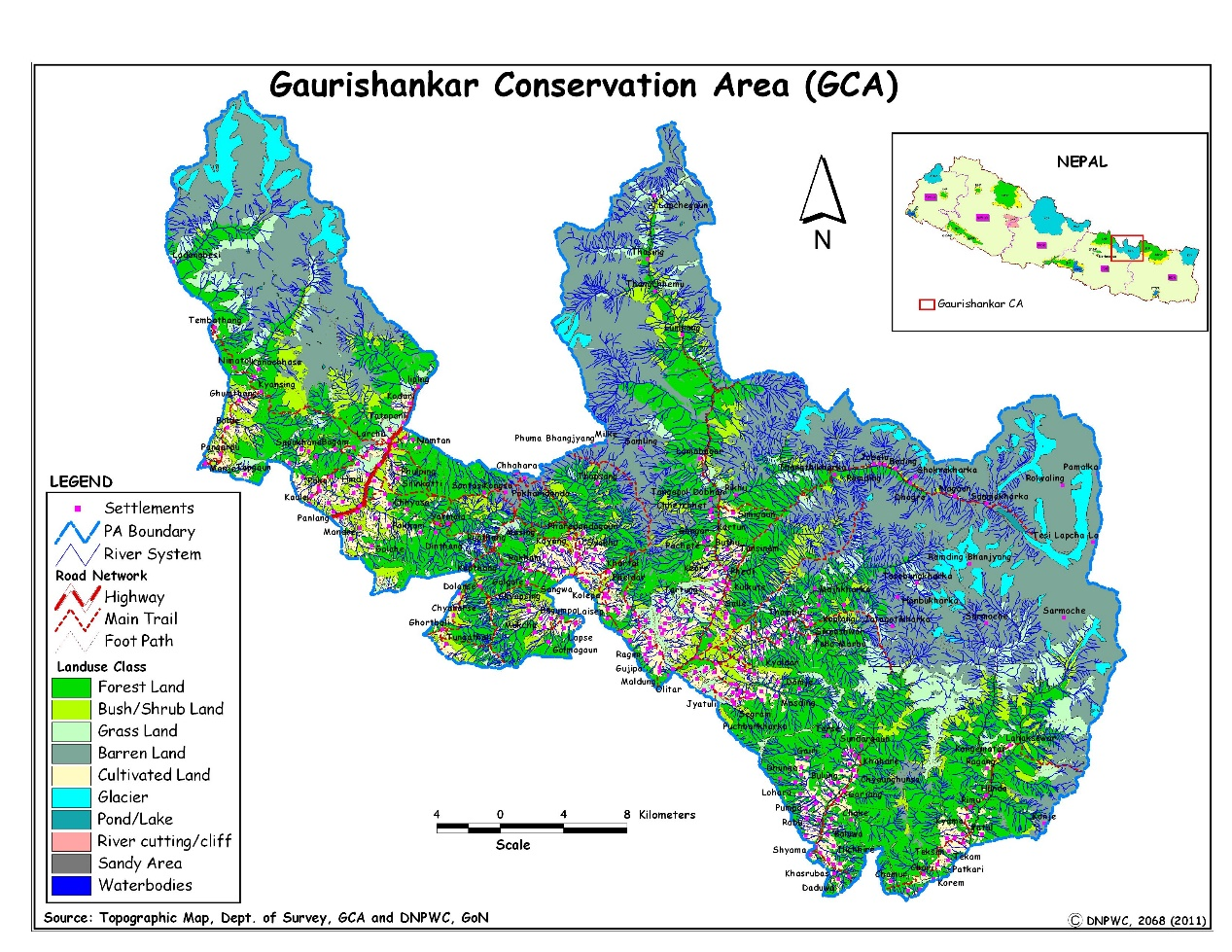 尼泊尔高卢山卡保护区占地面积2179平方公里,是连接国家两个重要保护区——萨加玛塔国家公园(Sagarmatha National Park)和朗塘国家公园(Langtang national park)的生物走廊。GCA具有重要的自然、文化和历史意义,由于海拔梯度的延长,具有丰富的生物多样性,水资源和冰川资源都极为丰富。