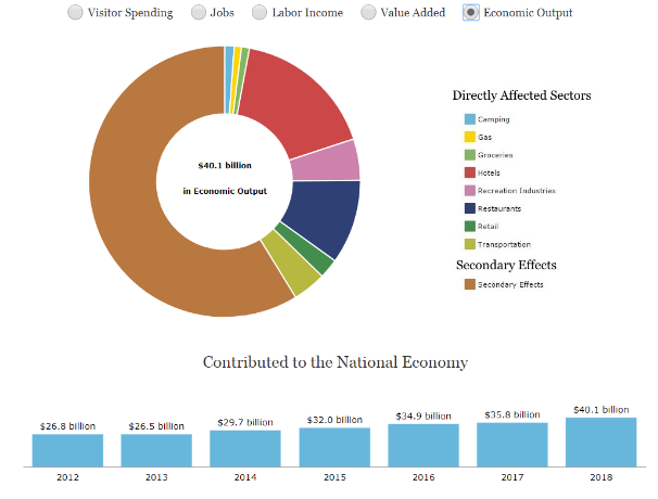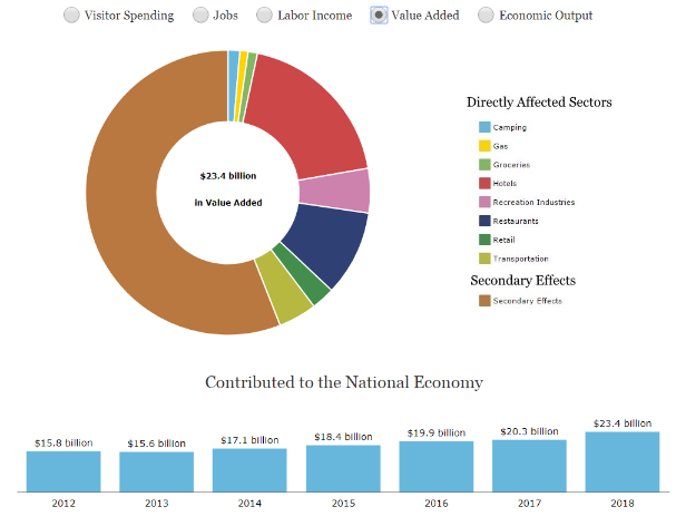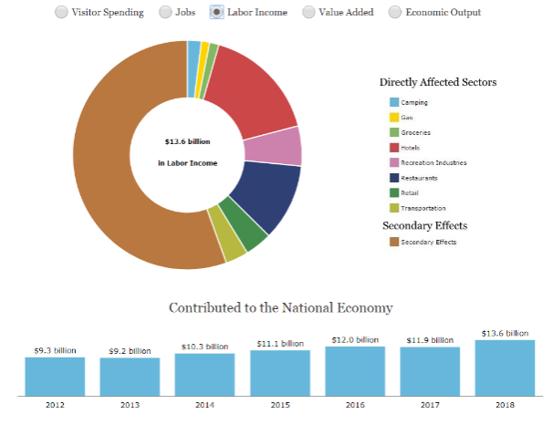从2012年到2018年,美国国家公园在游客消费、就业、劳动收入、附加值、国民经济产出等方面都保持了逐年增长的态势。2018年,3.18亿人次游客参观了位于美国各地的国家公园,共计花费约202亿美元。这些旅游收入支持了32.9万个就业岗位,实现了136亿美元的劳动收入、234亿美元的附加价值和401亿美元的国民经济产出。