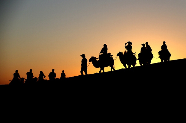 Visitors enjoy beautiful views of dusk at the Mingsha Mountain and Crescent Spring scenic spot in Dunhuang City, Gansu Province, August 9, 2024. /CFP