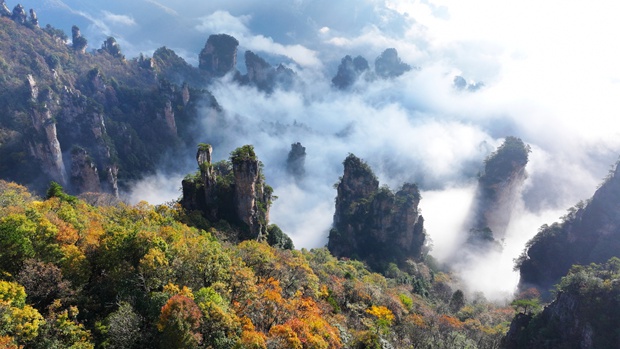 A sea of clouds recently gathered after a spell of rain this early winter in the Wulingyuan scenic area of Zhangjiajie National Forest Park in central China's Hunan Province. The misty scene, coupled with colorful foliage adorning the park's iconic peaks, resembles a series of natural mountain paintings. With temperatures fluctuating, the region is anticipated to experience its first snowfall in December.