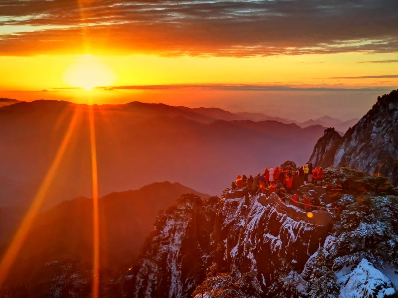 At the dawn of the day, a faint light slowly rises from the horizon, and the rays of light pass through the continuous ridges, only to bring the earliest morning greetings to the tourists who are eagerly waiting. At this moment, Mount Huangshan seems to have been endowed with life, quiet and full of vitality.