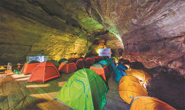 Camping in one of the caves at the Shier Beihou scenic area.[Photo provided to China Daily]