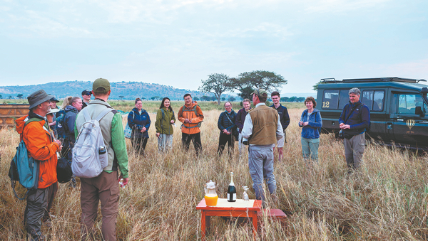 Chinese and foreign tourists relax and celebrate after their hot air balloon flight over the Serengeti National Park in Tanzania. CHINA DAILY