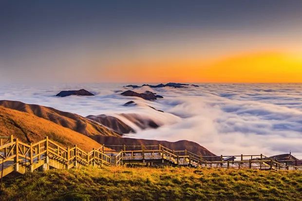 Wugong Mountain is famous for its magnificent peaks and abundant natural resources. The scenery of the mountain, such as the sea of clouds, sunrise, and meadows, is beautiful beyond description, especially in summer when the alpine meadows are covered with wildflowers, like a fairyland on earth.