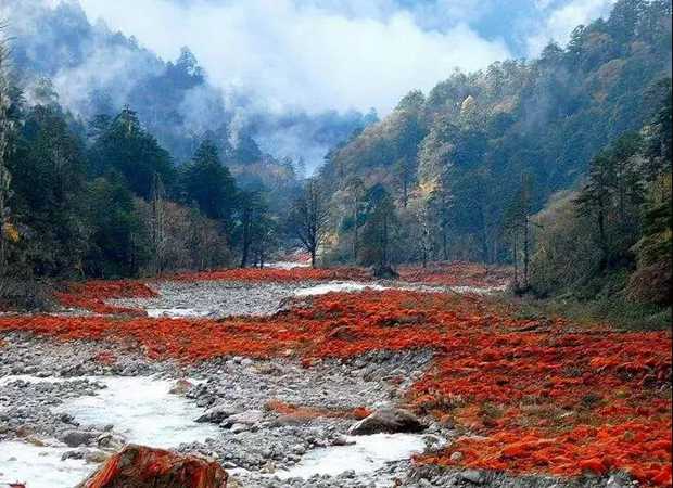 红石是大自然赠送给贡嘎山地区最珍稀的物种之一。在海螺沟、燕子沟、南门关沟、雅家埂等景区里分布着大面积的红石滩,每一块石头都被红色苔藓披上了一件美丽的红色外衣,红石在河流两旁堆积,成群的红石变成一种流动的红色,与清冽的流水相伴顺流而下,让人感叹大自然的神奇造化。
