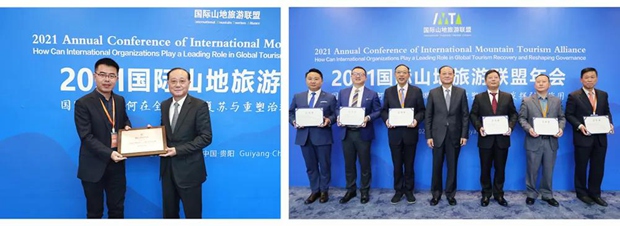 图右:国际山地旅游联盟副主席邵琪伟向新会员单位颁发会员证书
