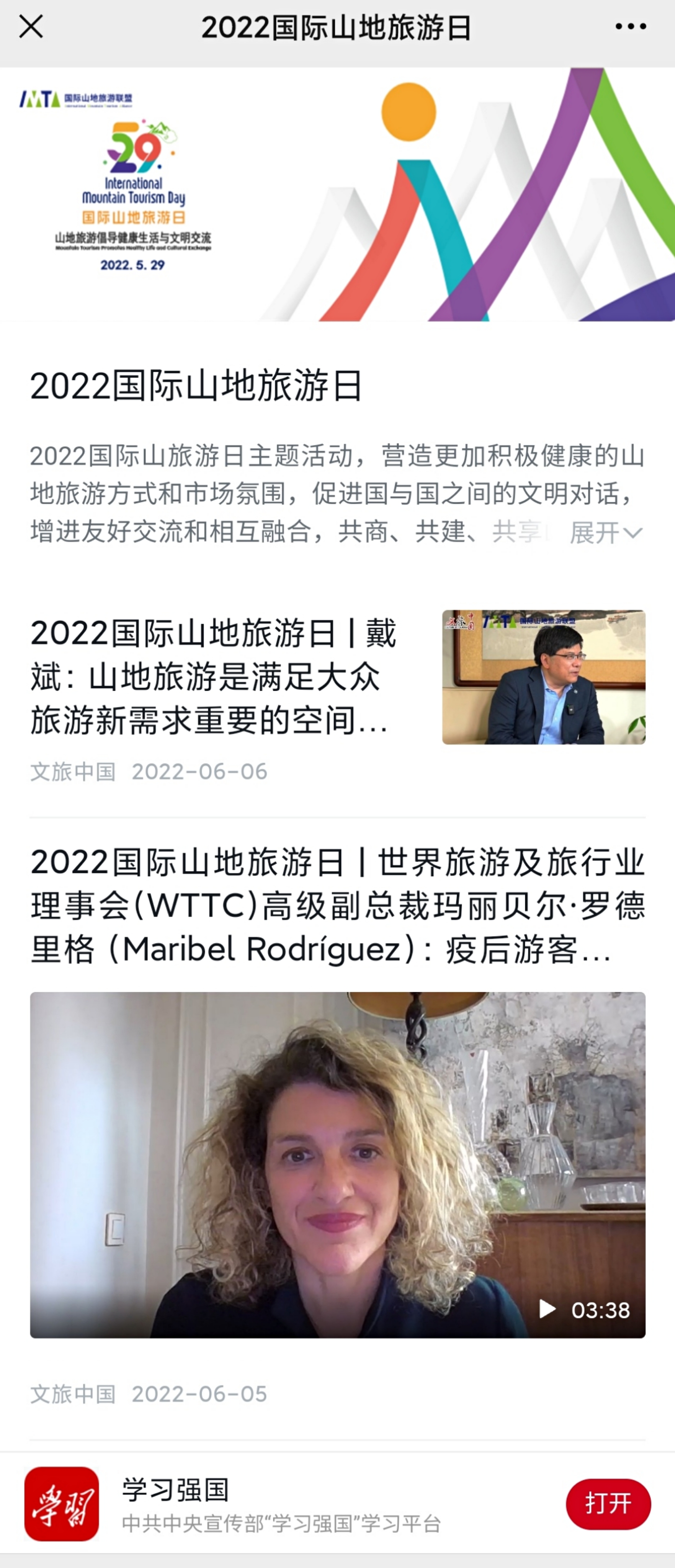 5月21日—5月30日,作为文化和旅游部官方新媒体客户端——文旅中国专题采访了全球17个山地主题活动。采访对象从体育局、艺术中心、旅游集团领导到营地、房车、户外装备创始人,再到户外急救专业人员、户外体裁影视剧拍摄导演等,从多个角度介绍山地旅游,为主题活动赋能。文旅中国客户端还推出了2022国际山地旅游日“山地旅游倡导健康生活与文明交流”主题倒计时海报开机屏。28篇重量级报道引起网友共鸣,大众期待山地旅游得到广泛推广,阅读量达到683万。