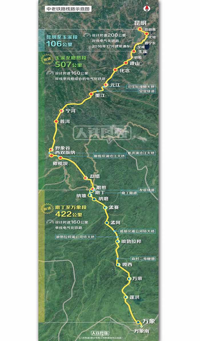 中老铁路于2021年12月全线通车,连接昆明和万象,其中国内段长613公里,老挝段长422公里,设计时速160-200公里,全线采用中国标准。