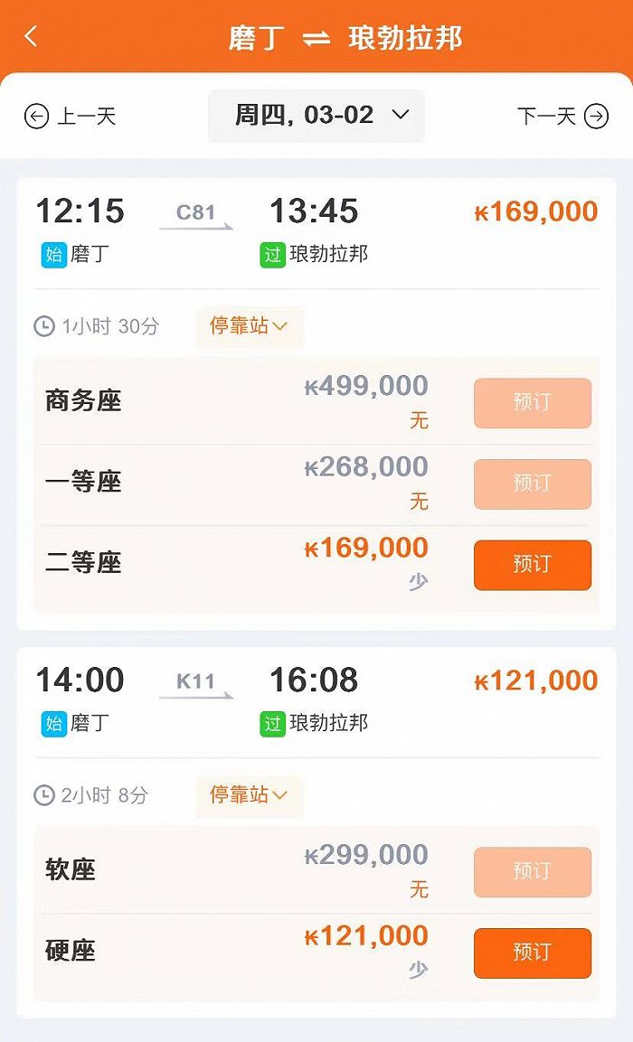 轰轰姐告诉界面新闻,目前在老挝磨丁站,每天开行两趟列车,发车时间为12:15和14:00。之前上午出境到磨丁,一般都能坐上这两趟车,但是最近早上到达后,基本只能买到第二天或第三天的票。