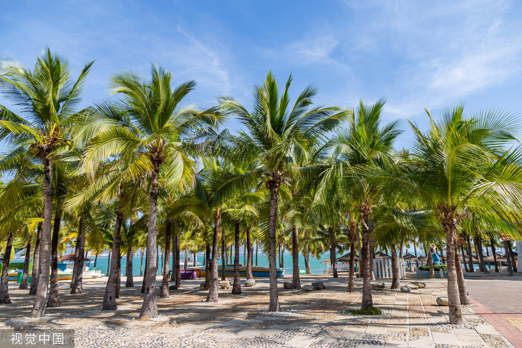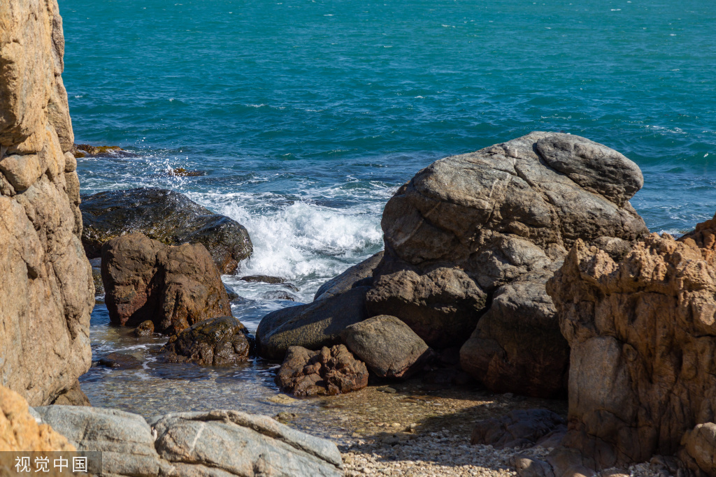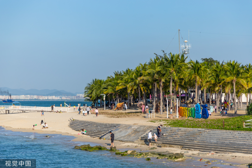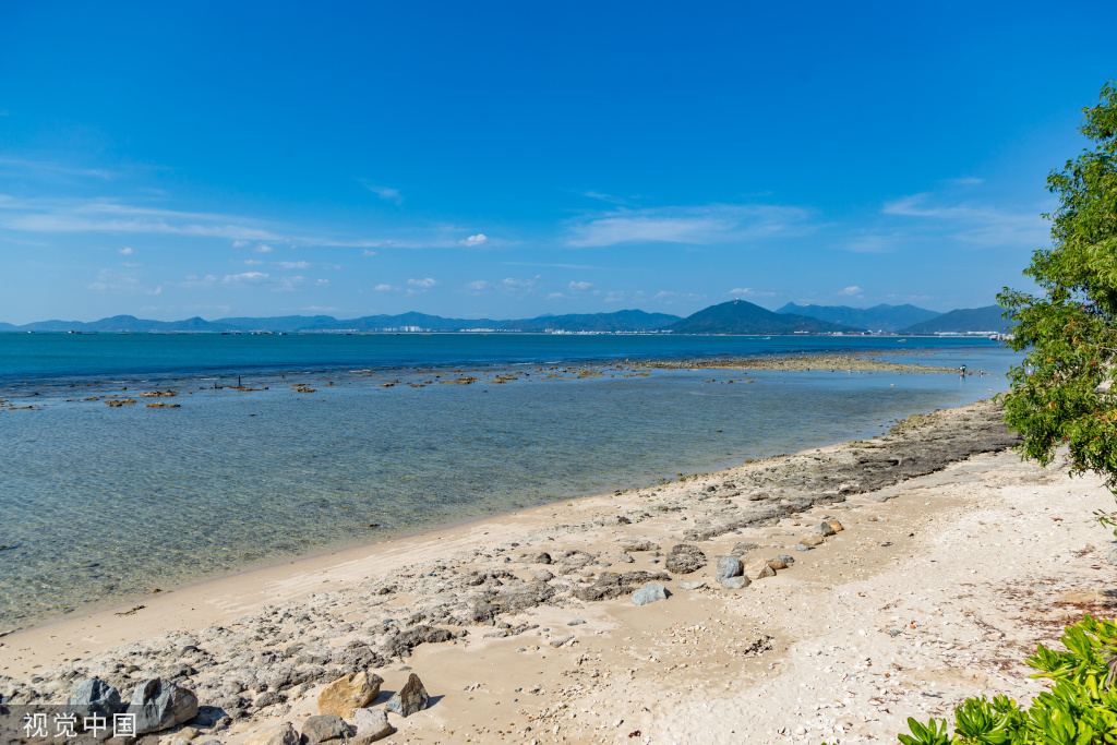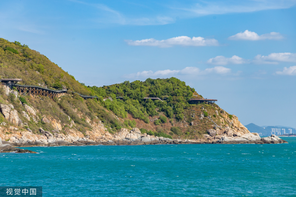 2023年2月23日,三亚,西瑁洲岛天蓝海碧。三亚西瑁洲岛也叫三亚西岛或玳瑁岛,总面积2.8平方千米,是一座位于北纬18°的蔚蓝小岛,岛屿北部为居民区,南部大部分为荒山林地,南海岸线多为峭壁。