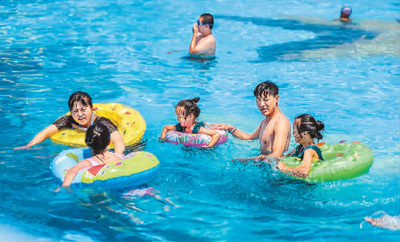 7月1日,游客在河北省遵化市娘娘庄镇水上乐园戏水避暑。刘满仓摄(人民图片)