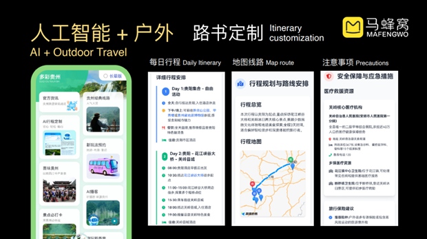 接下来的AI时代,可以最大限度地实现个性化旅游,这些丰富的玩法,和AI是天然适配的。马蜂窝的AI能力将会派上大用场。像我们推出的AI行程定制,收录了各种新玩法,可以将山地户外项目巧妙的融合到行程中,与用户需求精准匹配。
