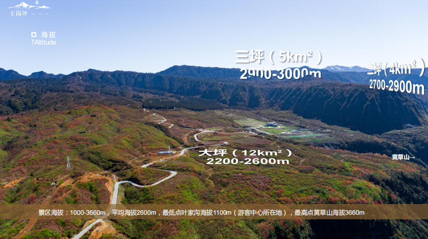 王岗坪景区的范围很广,三阶高山台地地形抬升,海拔依次升高,当地人称:大坪(海拔2500米)、二坪(海拔2800米)、三坪(海拔接近3000米),面积超过20平方公里,黄草山是海拔最高的地方,3700米。这样的区域和海拔,造就生物多样性,是天然的生命庇护所,造就了集川西精髓于一身的“十二盛景”。