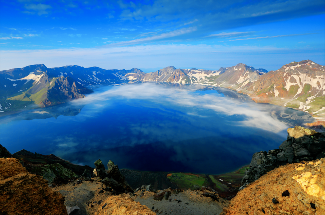 由于多次火山喷发,长白山山顶堆积了大量灰白色的浮石,再加上天气寒冷,山顶常年积雪,从远处望去,山峰上白雪皑皑,因此得名——长白山。壮美纯净的长白山天池,被周围十六座山峰环抱,颇有众星捧月之势,朵朵白云倒映在湛蓝的湖水中,与蓝天互携相映,以一池碧水伴美人间。