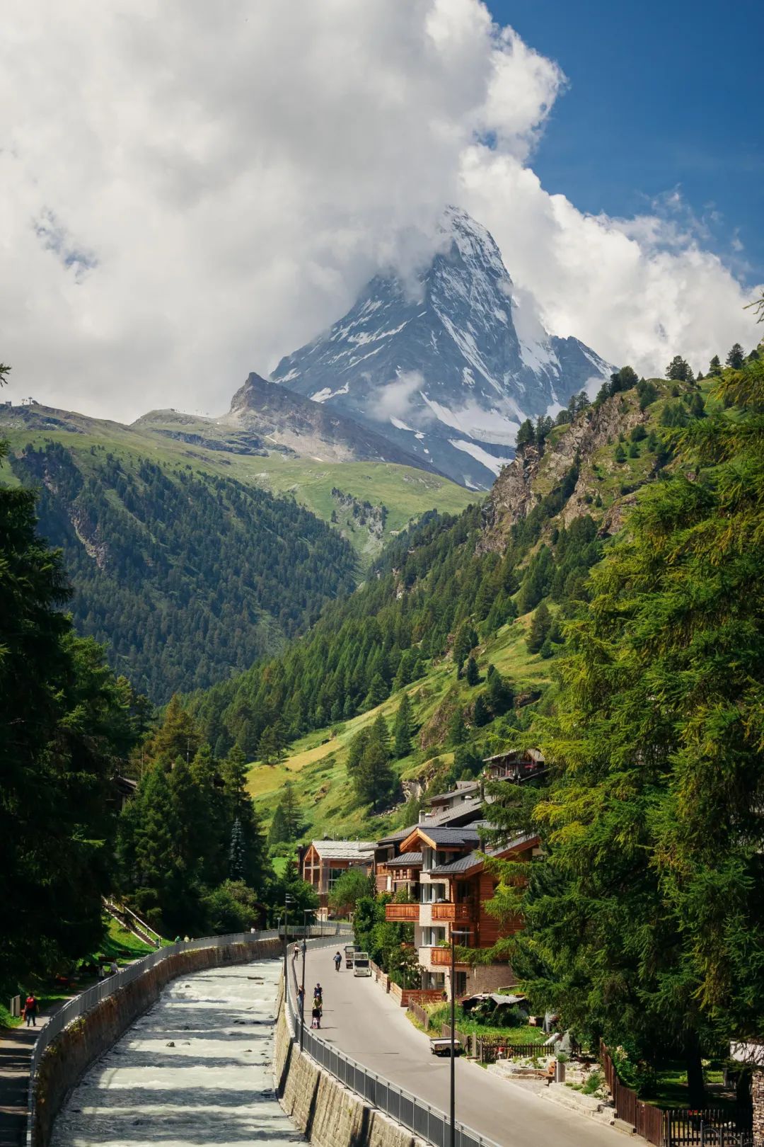 这里是观赏马特宏峰的最佳地点,小镇中心的马特菲斯河边更是观赏马特洪峰晨曦的不二之选,从这个位置顺着空旷的河道望过去,没有了屋顶和树枝遮挡的群山之王显得更加雄伟壮观。