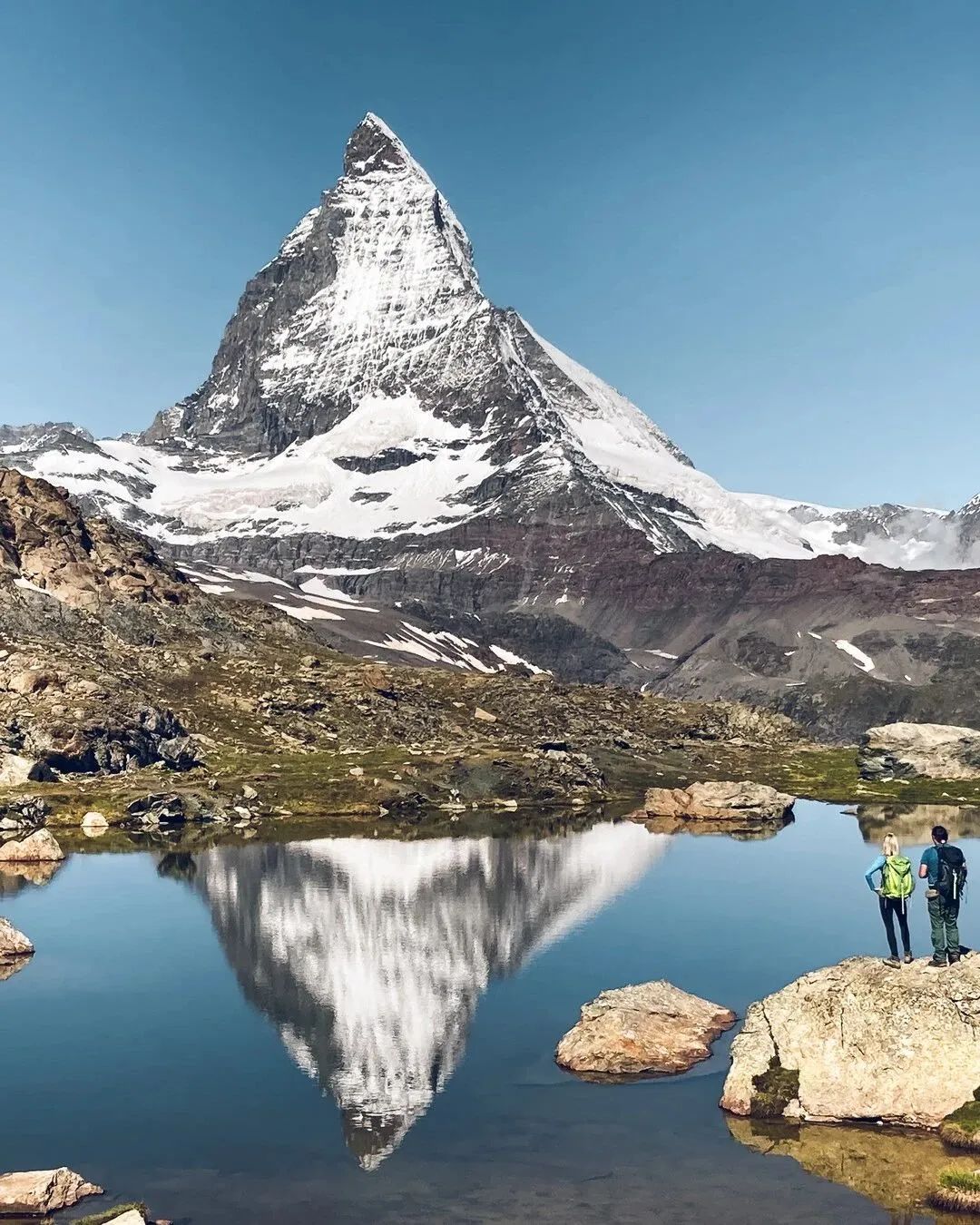 利菲尔湖(Riffelsee)海拔2757米,是马特宏峰最佳观景点之一。这是一段缓坡路,行走容易,景色却惊心动魄,站在湖畔,静静欣赏清澈见底的利菲尔湖湖面上马特宏峰的倒影,美到令人失语。