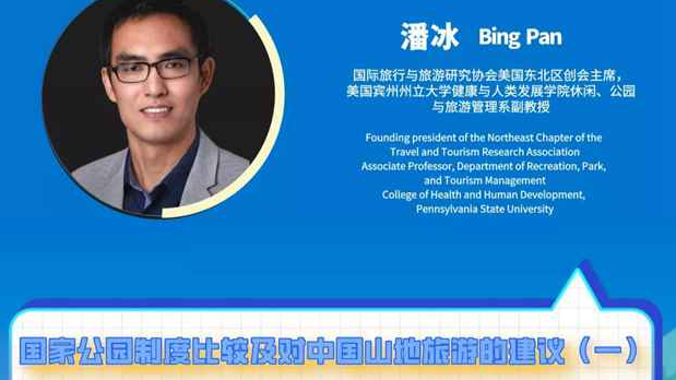 本期由国际旅行与旅游研究协会美国东北区创会主席,美国宾州州立大学健康与人类发展学院休闲、公园与旅游管理系副教授潘冰分享《国家公园制度比较及对中国山地旅游的建议》(一)