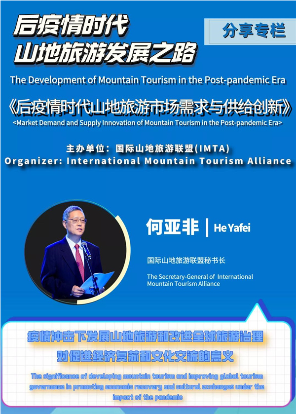 国际山地旅游联盟本着“保护山地资源、传承山地文明、促进山地经济、造福山地民众”的宗旨,针对当前疫情挥之不去、世界旅游业持续低迷的情况,创办了“后疫情时代山地旅游发展之路”分享专栏。第一期以“后疫情时代山地旅游市场需求与供给创新”为题,邀请世界旅游组织、教科文组织等权威机构的旅游专家,以视频直播形式对山地旅游发展利好政策、市场机遇、行业需求、项目提升和营运技巧进行解读、分析、研判和分享。