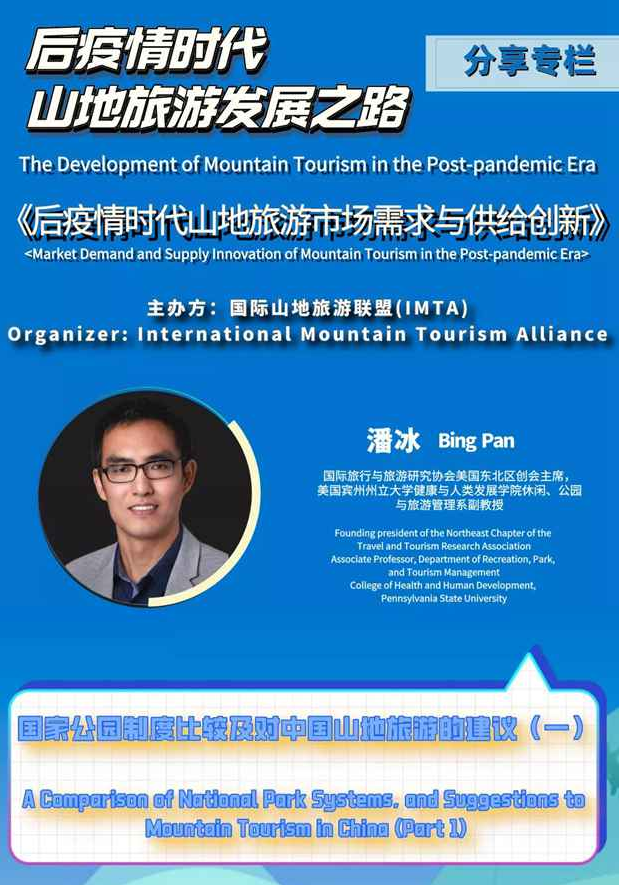 本期由国际旅行与旅游研究协会美国东北区创会主席,美国宾州州立大学健康与人类发展学院休闲、公园与旅游管理系副教授潘冰分享《国家公园制度比较及对中国山地旅游的建议》(一):