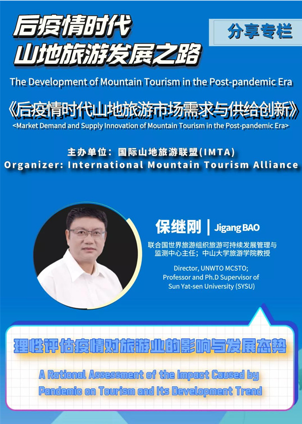 国际山地旅游联盟本着“保护山地资源、传承山地文明、促进山地经济、造福山地民众”的宗旨,针对当前疫情挥之不去、世界旅游业持续低迷的情况,创办了“后疫情时代山地旅游发展之路”分享专栏。第一期以“后疫情时代山地旅游市场需求与供给创新”为题,邀请世界旅游组织、教科文组织等权威机构的旅游专家,以视频直播形式对山地旅游发展利好政策、市场机遇、行业需求、项目提升和营运技巧进行解读、分析、研判和分享。