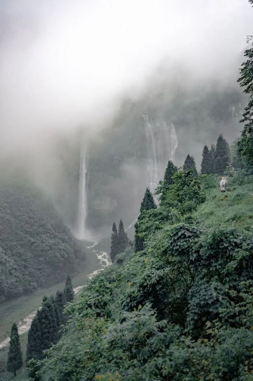 就像新西兰米尔福德峡湾的经典画面——雨天里,数条瀑布从雪山之巅顺着山体脉络奔涌,海风将水流吹成漫天水雾,神秘又磅礴——这样的震撼,其实在贵州的深山里就能寻见。