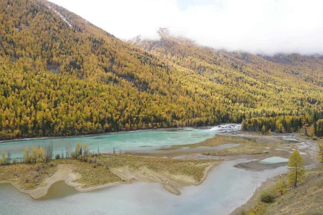 再往外走便是卧龙潭,喀纳斯湖将部分泥沙堆积于河心形成了卧龙状的河心洲,从高空俯瞰,水面碧绿洁净,宛若飘带萦绕于山谷间。