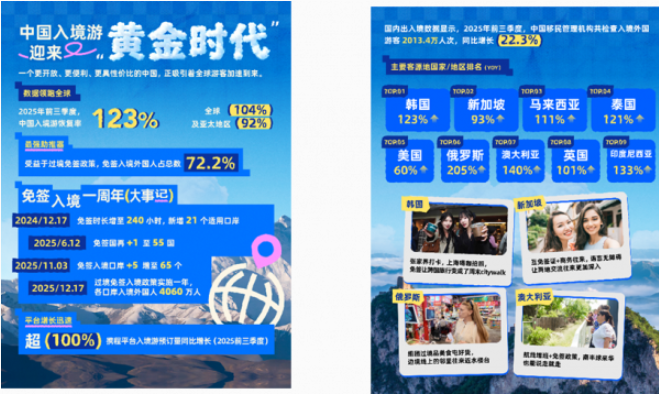 12月31日,携程发布《2025中国入境游年度报告》(以下简称“报告”),数据显示,2025年前三季度入境游预订已经实现了100%的增长,来自免签国家的订单增幅平均高达153%。这一系列数据不仅标志着行业全面复苏,更显示出中国正加速向“十五五”规划建议中提出的“旅游强国”目标迈进。
