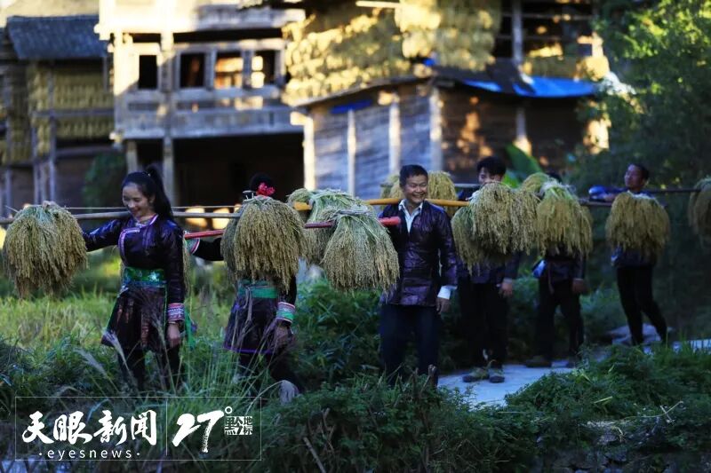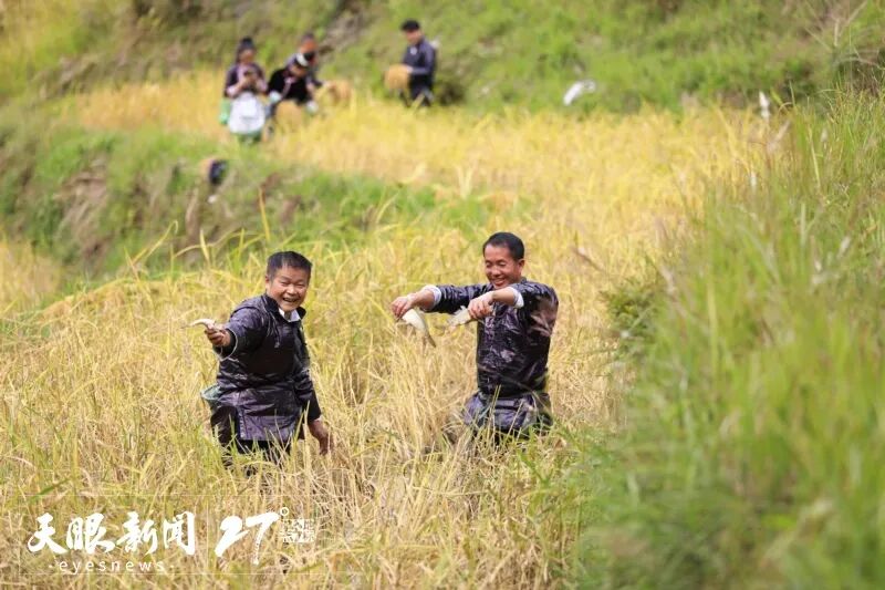 围绕“香禾糯”这一地标产品,黄岗村开发了系列体验活动。春日,游客体验下田插秧种香禾糯;秋日,亲手收割沉甸甸的稻穗;闲暇时,还能挽起裤脚在田里追稻花鱼,体验后再品尝用香禾糯、稻田鱼、咸鸭蛋做成的侗家宴,原生态美食让人回味无穷。